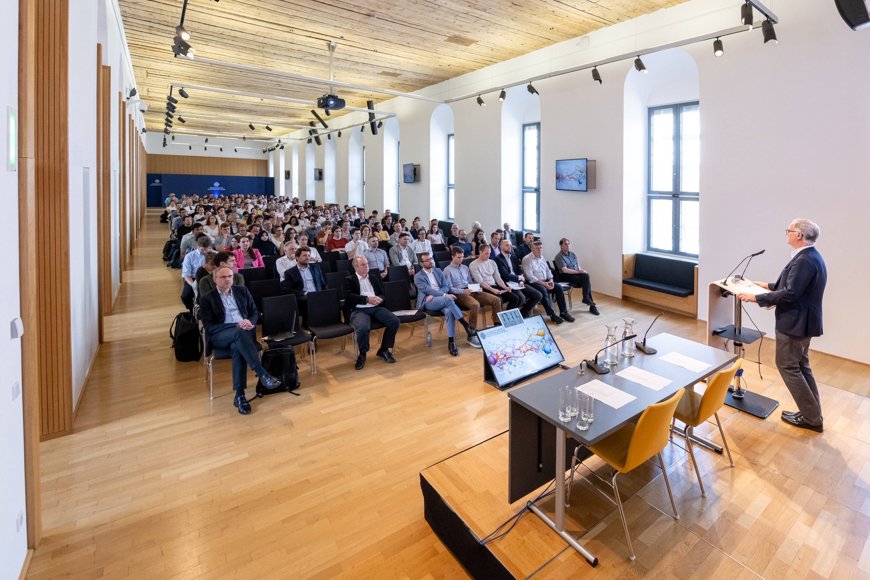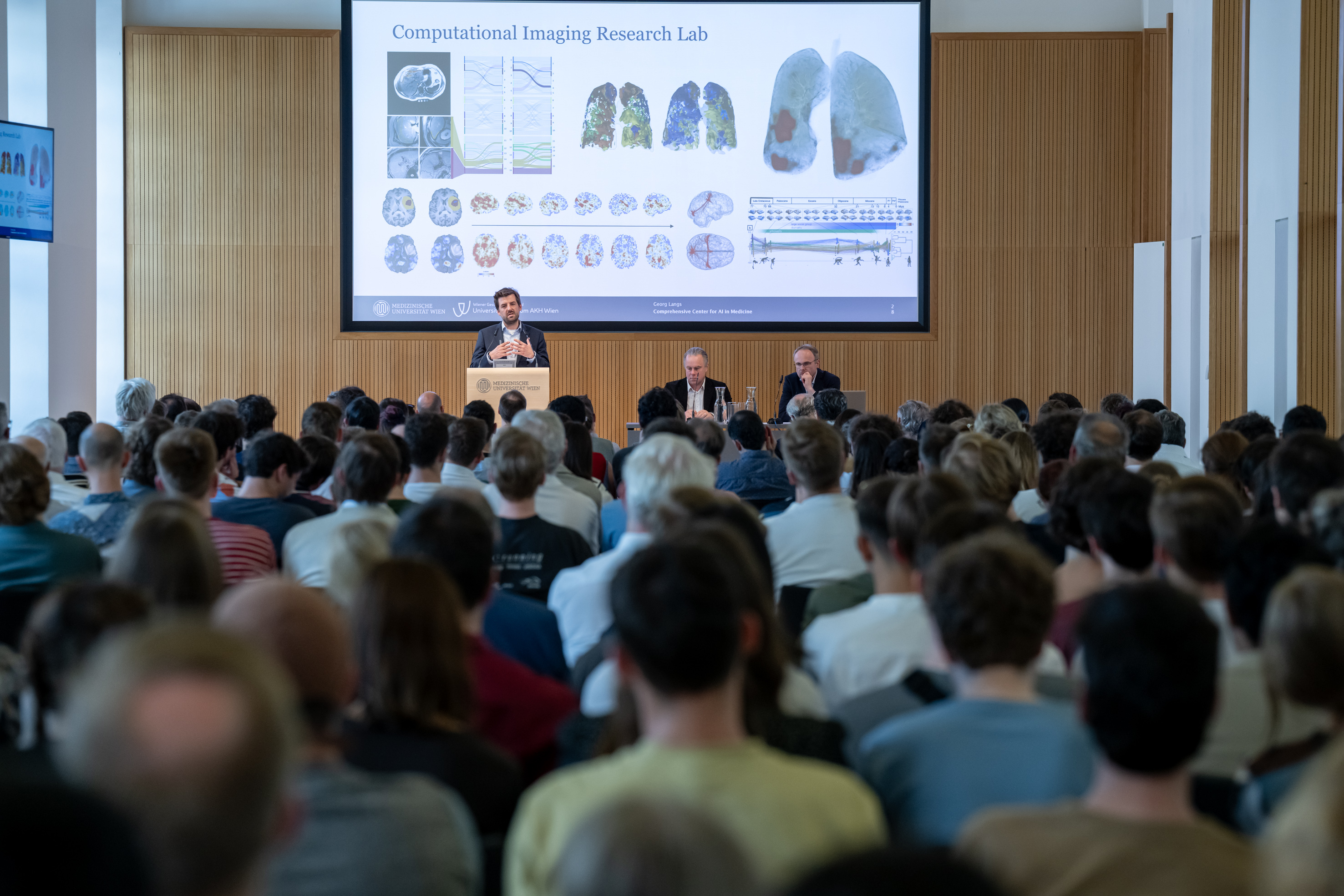 Rektor Markus Müller opened with a talk on the role of AI in medicine, and how it motivates us to reflect on human intelligence and the discruption caused by technological advance. Georg Langs discussed three among the reasons why CAIM has started as an initiative driven by the PIs: the need to link cutting edge research in machine learning and precision medicine and prevention, the value of talent and the environment we provide to attract, support, and educate creative scientists in this field, and finally the hard questions in medicine that are yet unanswered.